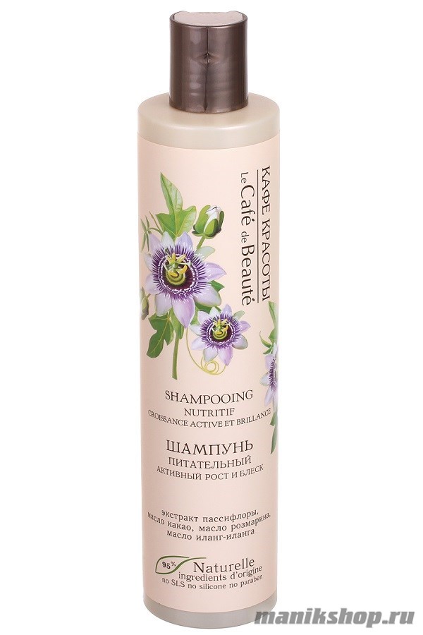 Шампунь Питательный Активный рост и блеск - экстракт пассифлоры, масло какао, масло розмарина, масло иланг-иланга.