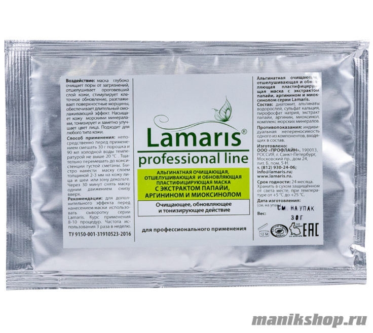 Применение: непосредственно перед применением смешать до консистенции густой сметаны состав маски с холодной водой (t не выше 20 °С). Быстро нанести маску слоем толщиной 2-3 мм на кожу лица и шеи или зону декольте. Через 30 минут снять маску одним движением снизу вверх.