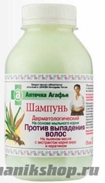 Aктивные компоненты, входящие в состав шампуня, обеспечивают оздоровление луковицы волоса, стимулируют ее усиленное кровоснабжение, повышают тонус кожи. Корень аира – традиционное средство, применяемое при начинающемся облысении. Содержит большое количество витамина С, а также обладает выраженным антимикробным действием. Линоленовая ненасыщенная жирная кислота, входящая в состав льняного масла – природный эликсир молодости. Она улучшает клеточный обмен, укрепляет барьерную функцию кожи. Кератин – эластичный, прочный белок, входящий в состав волос и ногтей, удерживает влагу, препятствует обезвоживанию кожи головы и волос Мыльный корень – это естественная, более щадящая основа для мытья волос, в отличие от используемой в обычных шампунях. Дерматологический шампунь рекомендуется как профилактическое средство против выпадения волос. Продукт прошел лабораторные испытания в ЦНИКВИ Минздрава России.