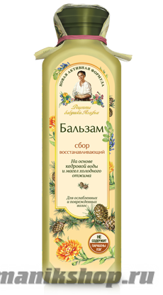 Кедровая вода, входящая в состав бальзама, оказывает регенерирующее действие на волосы, а экстракты сибирских трав наполняют их силой и энергией. Масла холодного отжима образуют защитный слой, предохраняя волосы от пересушивания и облегчая расчесывание. «Волосы, поврежденные да занедужившие, врачуй водицей целебной: почки кедровые размочи, да с травушками повари с полчасика, после остуди да на волосы нанеси – пусть силой напитаются». Из советов Агафьи Ермаковой