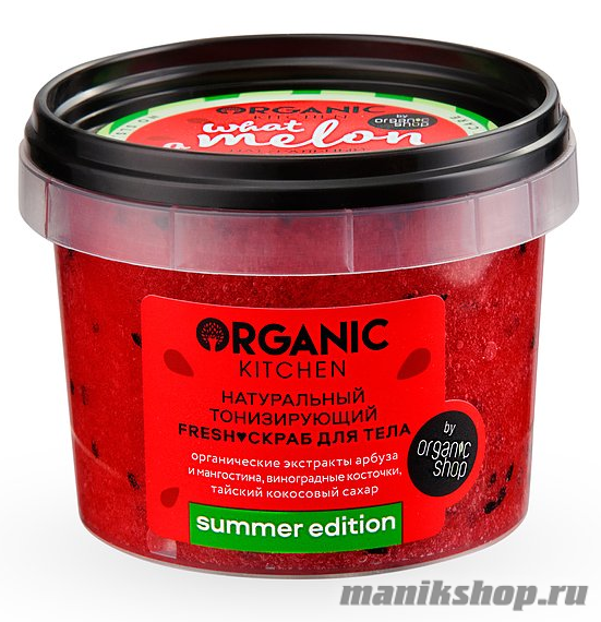 Полная перезагрузка и глубокое очищение вашей кожи, идеальное ощущение прохлады и неповторимые аромат в тонизирующем скрабе для тела. Органические экстракты арбуза и мангостина наполняют клетки кожи живительной влагой, витаминами красоты, придают здоровое сияние и ухоженный вид. Виноградные косточки и тайский кокосовый сахар деликатно отшелушивают и полируют, повышая тонус и упругость кожи. Всегда FRESH и +100500 к вашему настроению!