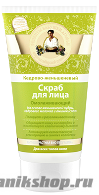 Кедрово-женьшеневый скраб для лица бережно обновляет кожу, обогащает кислородом и способствует клеточному дыханию. Женьшеневая пудра полирует и разглаживает кожу, способствует естественной регенерации и омоложению. Кедровое молочко богато антиоксидантами и витамином Е, глубоко питает, делая кожу нежной и бархатистой.
