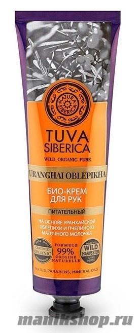 Natura Siberica Tuva Био-крем для рук питательный на основе уранхайской облепихи и пчелиного маточного молочка помогает забыть о таких проблемах, как сухость и покраснение кожи рук, и дарит ощущение мягкости и ухоженности. Уранхайская облепиха растет на крайнем Севере и выдерживает самые суровые природные условия. В ее составе уникальный комплекс витаминов и аминокислот, заботливо питающих вашу кожу и защищающих ее от вредного воздействия внешней среды. Маточное молочко – сокровищница полезных веществ, в нем содержатся 22 аминокислоты, что обеспечивает превосходные питательные свойства крема. Высокое содержание витаминов В5 (пантотеновая кислота) и В7 (биотин) способствуют улучшению состояния кожи ваших рук, освежает и омолаживает.