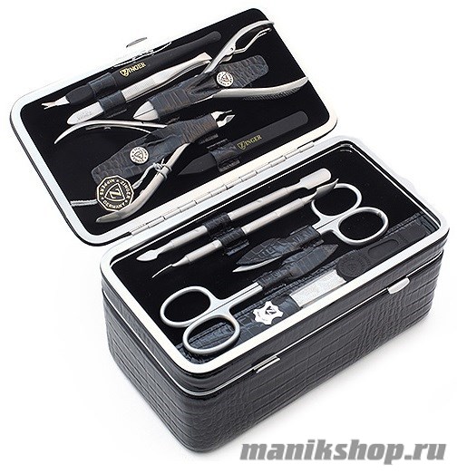 Состав маникюрного набора ZINGER CASE-1201-804: инструментальная сталь, пластик. Состоит из 10 предметов: - ножницы для кутикулы, - ножницы для ногтя, - кусачки для кутикулы, - кусачки для педикюра, - триммер (V образная палочка для обрезания кутикулы), - пинцет, - металлическая пилка, - пластиковая палочка для отодвигания кутикулы, - 2 металлических шабера разного размера (палочки для отодвигания кутикулы и чистки ногтя).