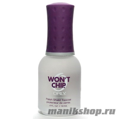 Прочное верхнее покрытие Won't Chip с полимерной защитой, которое предохраняет и ноготь, и лак на ногте, а также придает дополнительный блеск. Предотвращает отслаивание и скалывание лака в течение 2-х недель.
