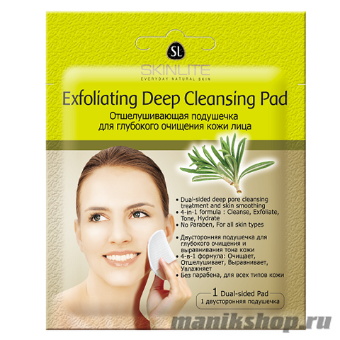 Отшелушивающая подушечка для глубокого очищения кожи лица SKINLITE предназначена для обновления кожи, избавления от ороговевших клеток и подготовки кожи к дальнейшему уходу. Каждая подушечка с одной стороны шероховатая, а с другой - мягкая. Шероховатая сторона отшелушивает ороговевшие клетки, а мягкая удаляет загрязнения, приводящие к образованию прыщей и комедонов. Помимо механического воздействия на кожу, подушечка оказывает увлажняющий оздоравливающий и лифтинговый эффект за счет пропитки составом из мощных антиоксидантов, очищающих и омолаживающих ингредиентов: гиалуроновой кислотой, экстрактами папаи, гамамелиса, алоэ, ромашки, мелиссы, розмарина, тимьяна, жасмина лекарственного, эвкалипта, лайма, сосны, нероли, бергамота, лимона, а также коллагена.