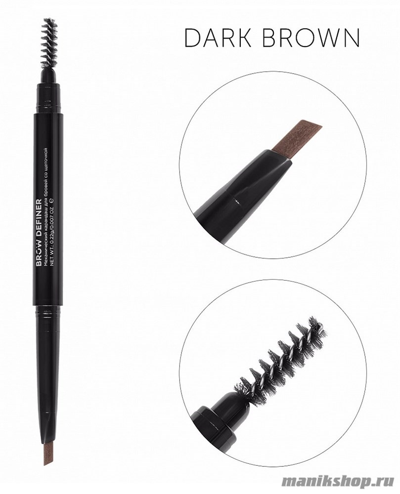 Грифель специальной формы идеально прокрашивает и подчеркивает изгиб бровей, а мягкая щеточка моделирует форму.