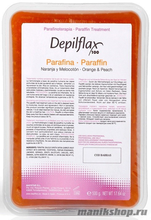 Depilflax100 Персик - Апельсин - это высококачественный парафин, который используется для проведения процедуры, как в салонах красоты, так и в домашних условиях. Можно использовать для рук и ног. Парафин обогащен провитамином А, что обеспечивает защиту от свободных радикалов. Идеально подходит для сухой и зрелой кожи. Способствует глубокому восстановлению и регенерации кожи, увлажняет и питает её. В состав средства включен каротин. Парафин имеет приятный аромат, цвет и консистенцию.